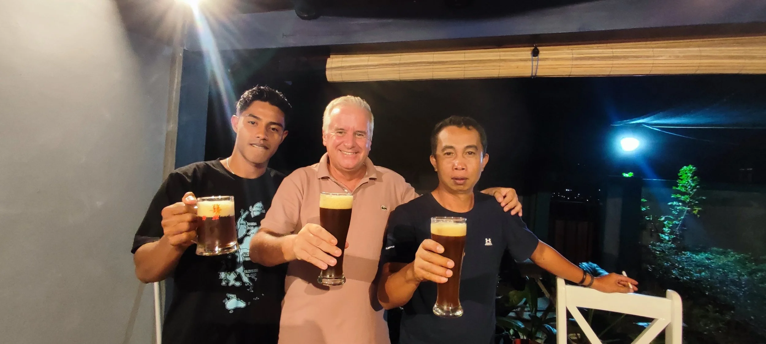 Image: Eky (left), IAJG Director Mikel Yaki (center) and IAJG certified guide Lister Pusung (right) enjoying a post expedition beverage.
