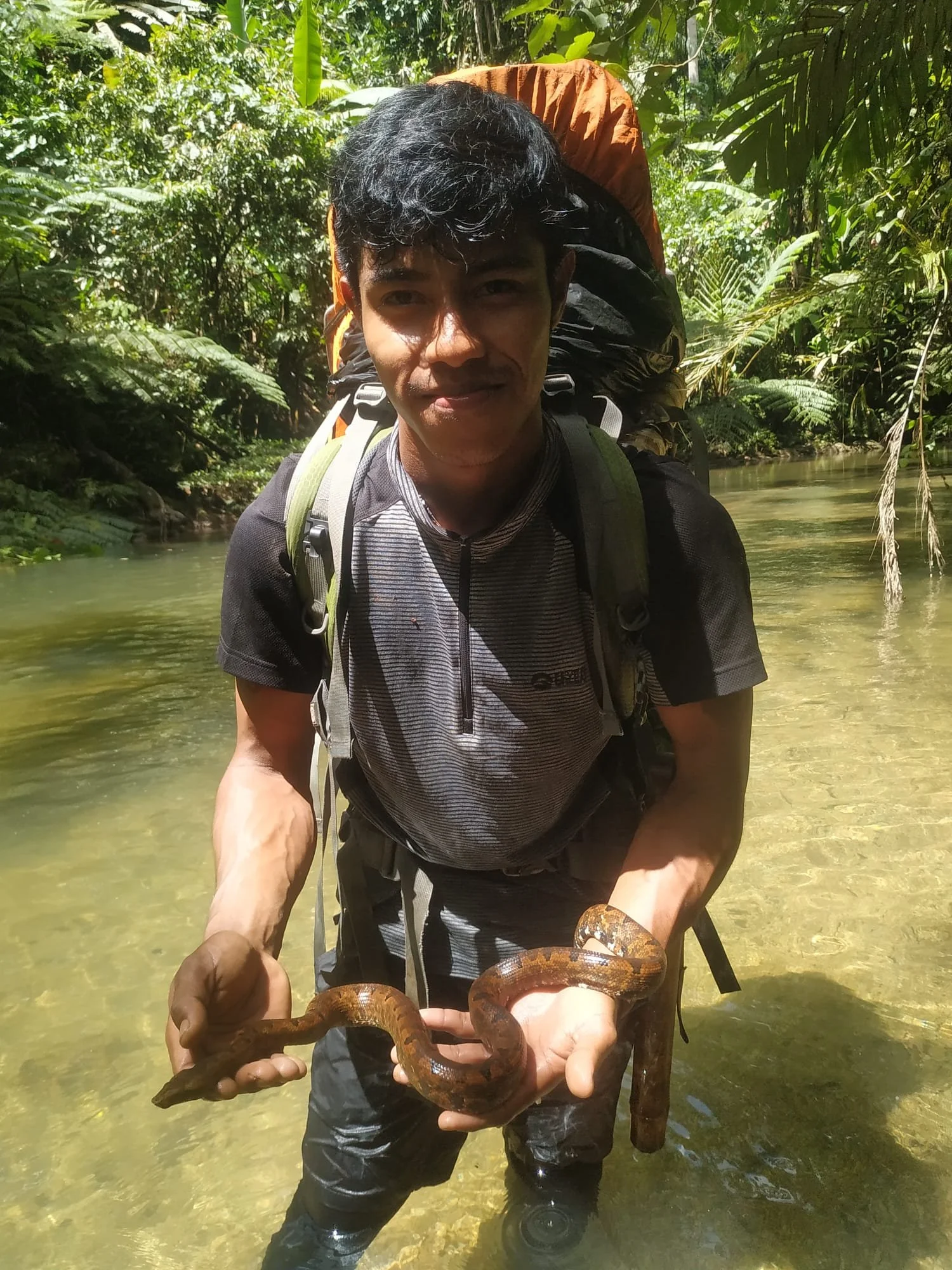 Image: Eky showing off his herpetology skills, posing with a snake to show to guests while on expedition.